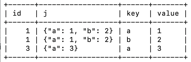 json_each | 将 JSON 对象的顶级元素展开为键值对。 | SELECT * FROM tj_test, LATERAL JSON_EACH(j); | ! json_each |
